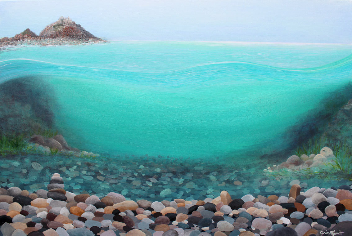 An image of a popular dive spot on the South Coast. Above the water level one can see Mimosa Rock and below the viewer can swim over a pebbled ocean floor.